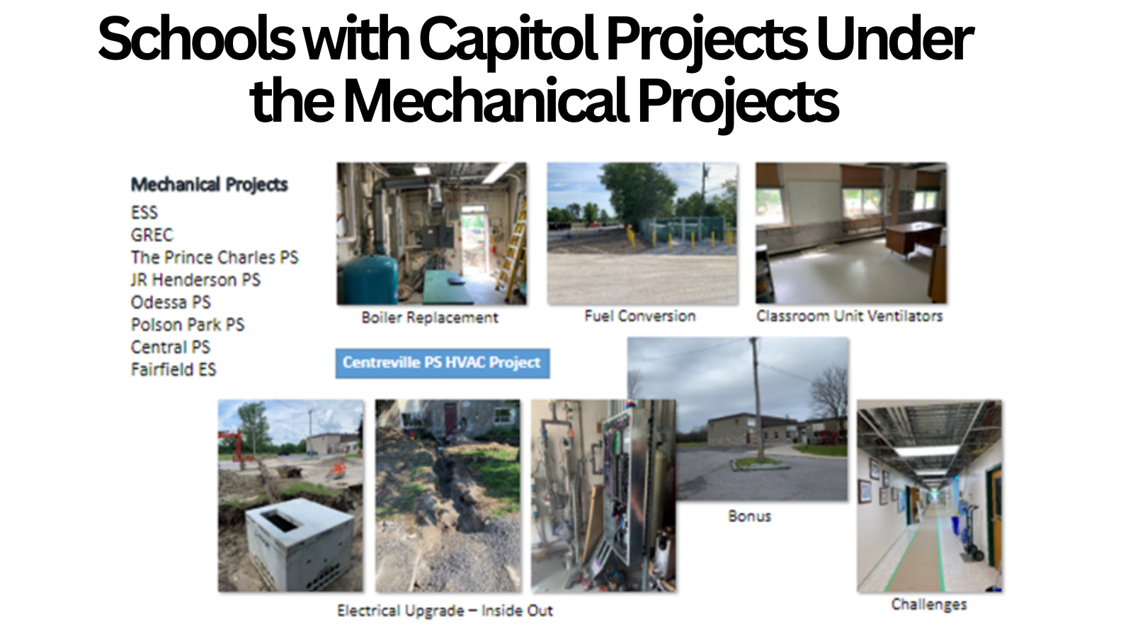 Schools with Capitol Projects Under the Mechanical Projects: Ernestown Secondary School, Granite Ridge Education Centre, The Prince Charles Public School, J.R. Henderson Public School, Odessa Public School, Polson Park Public School, Centreville Public School, Central Public School, and Fairfield Elementary School.